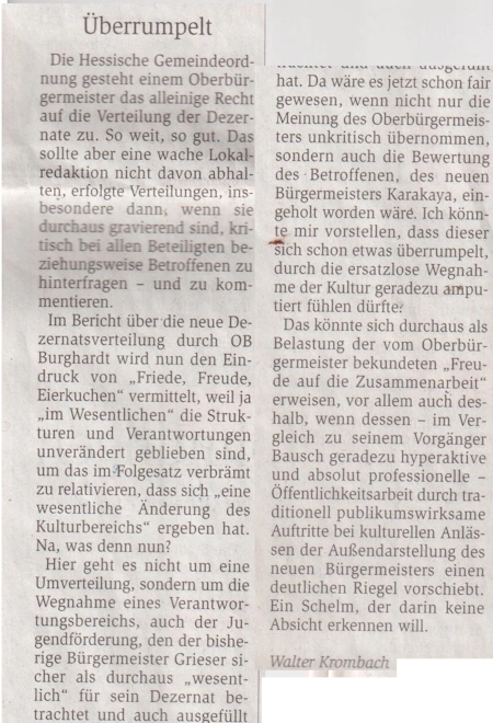 Die Hessische Gemeindeordnung gesteht einem Oberbürgermeister das alleinige Recht auf die Verteilung der Dezernate zu. So weit, so gut. Das sollte aber eine wache Lokalredaktion nicht davon abhalten, erfolgte Verteilungen, insbesondere dann, wenn sie durchaus gravierend sind, kritisch bei ALLEN Beteiligten bzw. Betroffenen zu hinterfragen - und zu kommentieren. Im Bericht über die neue Dezernatsverteilung durch OB Burghardt wird nun den Eindruck von "Friede, Freude, Eierkuchen" vermittelt, weil ja "im Wesentlichen" die Strukturen und Verantwortungen unverändert geblieben sind, um das am im Folgesatz verbrämt zu relativieren, dass sich "eine wesentliche Änderung des Kulturbereichs" ergeben hat. Na, was denn nun? Hier geht es nicht um eine Umverteilung, sondern um die Wegnahme eines Verantwortungsbereichs, auch der Jugendförderung, das der bisherige Bürgermeister Grieser sicher als durchaus "wesentlich" für sein Dezernat betrachtet und auch ausgefüllt hat. Da wäre es jetzt schon fair gewesen, wenn nicht nur die Meinung des Oberbürgermeisters unkritisch übernommen, sondern auch die Bewertung des Betroffenen, dem neuen Bürgermeister Karakaya eingeholt hätten. Ich könnte mir vorstellen, dass dieser sich schon etwas überrumpelt, durch die ersatzlose Wegnahme der Kultur geradezu amputiert fühlen dürfte. Das könnte sich durchaus als Belastung der vom Oberbürgermeister bekundeten "Freude auf die Zusammenarbeit" erweisen, vor allem auch deshalb, wenn dessen - im Vergleich zu seinem Vorgänger Bausch geradezu hyperaktive und absolut professionelle - Öffentlichkeitsarbeit durch traditionell publikumswirksame Auftritte bei kulturellen Anlässen, der Außendarstellung des neuen Bürgermeisters einen deutlichen Riegel vorschiebt. Ein Schelm, der darin keine Absicht erkennen will.