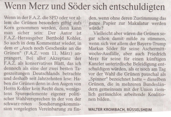 Egal, ob man als erstes die Überschrift eines Leitartikels, oder ohne auf den Kommentator zu achten: Wenn die SPD oder vor allem die Grünen besonders giftig auf's Korn genommen werden, dann kann man sicher sein: Der Autor ist FAZ-Herausgeber Berthold Kohler. So auch heute wieder, wo er "Auch noch Geschenke an die Grünen" anprangert. Bei aller Akzeptanz der FAZ als konservatives Blatt, das ich dennoch als eine der zwei besten Tageszeitungen Deutschlands betrachte und deshalb seit Jahrzehnten lese: derartig einseitiges, oft bösartig hetzerisches Bashing stößt sicher nicht nur mir auf, denn wenn Kohler-kritische Leserbriefe sogar abgedruckt werden, dann kann man getrost davon ausgehen, dass es massenweise weitere geben muss, sonst würden einige wenige nicht gelegentlich als Feigenblatt tatsächlich erscheinen. Zum konkreten Artikel: Haben die Grünen denn in den Augen von Herrn Kohler kein Recht dazu, wenigstens Spurenelemente eigener politische Wahlversprechen in den von der schwarzroten Sondierungskommission vorgelegten Vereinbarung zu finden, wenn ohne deren Zustimmung das ganze Papier zur Makulatur werden würde? Vielleicht aber wären die Grünen sogar schon damit milde zu stimmen, wenn sich vor allem der Bayern-Trump Markus Söder für seine Aschermittwochs-Ausfälle, aber auch Friedrich Merz für seine für einen künftigen Kanzler unterirdische Beleidigung entschuldigen würden, als er noch am Tag vor der Wahl die Grünen pauschal als "Spinner" bezeichnet hatte - dieselben Grünen, die in mehreren Bundesländern gemeinsam mit der Union ziemlich geräuschlos arbeitende Koalitionen bilden. Schade, Herr Kohler, denn läse man nur Ihre Beiträge - und die noch als Herausgeber(!), dann könne man meinen, die FAZ sei zu einem Kampfblatt gegen alles "Rot/Grün-Versiffte" verkommen. Aber zum Glück gibt es ja bei der FAZ auch noch Redakteure, die ein ausgewogeneres politisches Weltbild haben