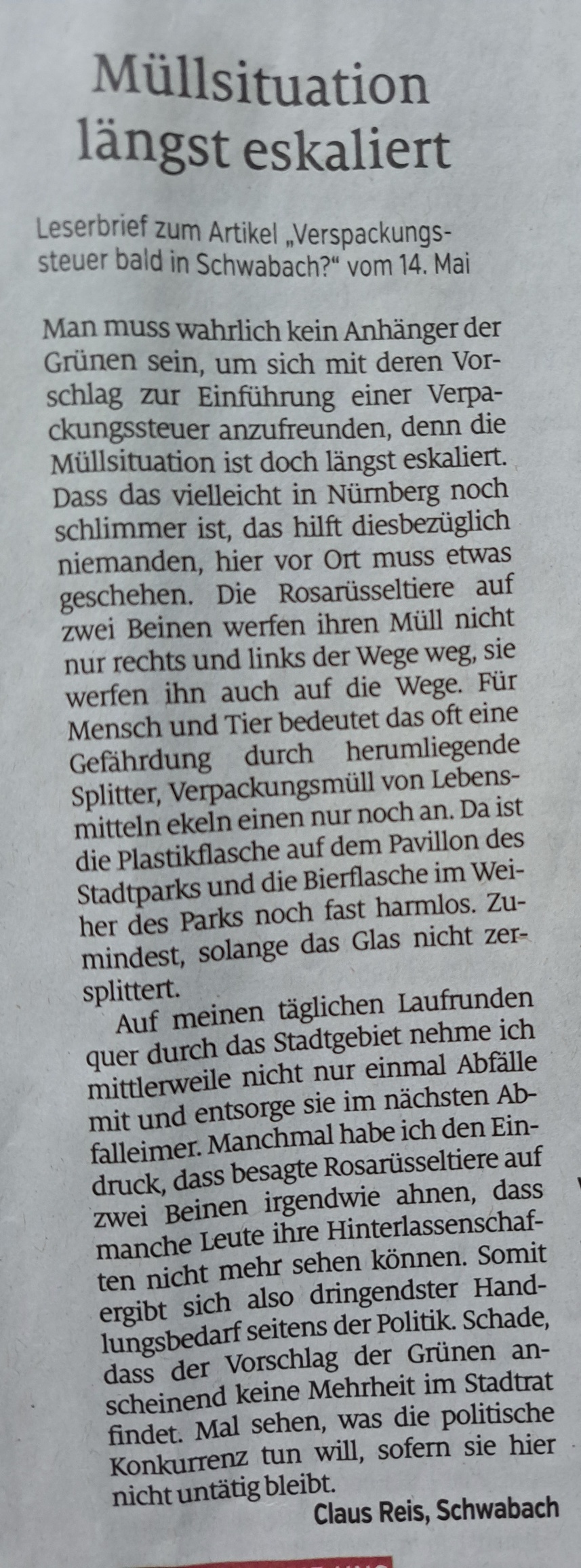 Man muss wahrlich kein Anhänger der Grünen sein um sich mit deren Vorschlag zur Einführung einer Verpackungssteuer anzufreunden, denn die Müllsituation ist doch längst eskaliert. Dass das vielleicht in Nürnberg noch schlimmer ist, das hilft diesbezüglich niemanden, hier vor Ort muss etwas geschehen. Die Rosarüsseltiere auf zwei Beinen werfen ihren Müll nicht nur rechts und links der Wege weg, sie werfen ihn auch auf die Wege. Für Mensch und Tier bedeutet das oft eine Gefährdung durch herumliegende Splitter, Verpackungsmüll von Lebensmitteln ekeln einen nur noch an. Da ist die Plastikflasche auf dem Pavillon des Stadtparks und die Bierflasche im Weiher des Parks noch fast harmlos. Zumindest solange das Glas nicht zersplittert. Auf meinen täglichen Laufrunden quer durch das Stadtgebiet nehme ich mittlerweile nicht nur einmal Abfälle mit und entsorge sie im nächsten Abfalleimer. Manchmal habe ich den Eindruck, dass besagte Rosarüsseltiere auf zwei Beinen irgendwie ahnen, dass manche Leute ihre Hinterlassenschaften nicht mehr sehen können. Somit ergibt sich also dringendster Handlungsbedarf seitens der Politik. Schade, dass der Vorschlag der Grünen anscheinend keine Mehrheit im Stadtrat findet. Mal sehen, was die politische Konkurrenz tun will, sofern sie hier nicht untätig bleibt.