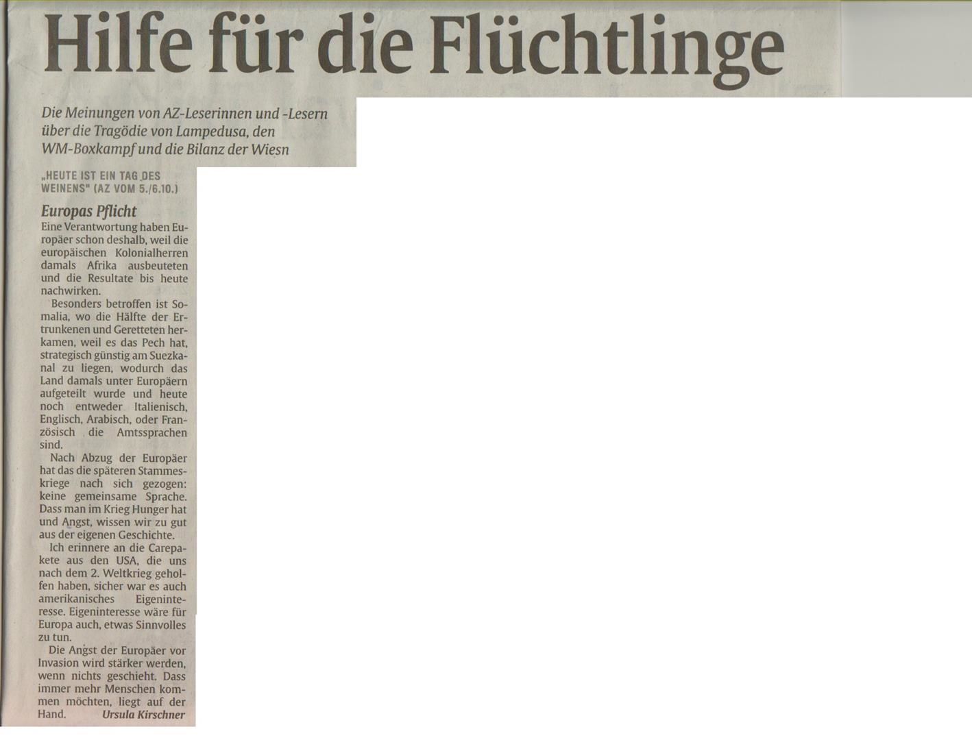 Besonders betroffen ist Somalia, wo die Hälfte der Ertrunkenen und Geretteten herkamen, weil es das Pech hat, strategisch am Suezkanal günstig zu liegen, wodurch das Land damals unter Europäern aufgeteilt wurde und heute noch entweder Italienisch, Englisch, Arabisch, oder Französisch die Amtssprachen sind, je nach N,S, Mittellage. Nach Abzug der Europäer hat das die späteren Stammeskriege nach sich gezogen: keine gemeinsame Sprache. Dass man im Krieg Hunger hat und Angst, wissen wir zu gut aus der eigenen Geschichte. Ich erinnere mich an unsere Carepakete aus den USA, die haben uns auch geholfen nach dem 2. Weltkrieg, sicher auch aus Eigeninteresse. Eigeninteresse wäre es für Europa auch, für Afrika etwas sinnvolles zu tun.