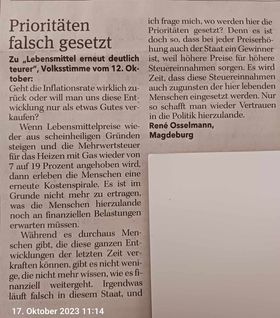Leserbrief zu Lebensmittel erneut deutlich teurer! Vom 12.10.2023