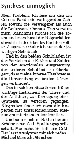 Das in solchen Situationen früher wichtige Instrument der These und der Antithese, zur Erzeugung einer Synthese, ist verloren gegangen. Nirgendwo finde ich z.B. den Virologen Drosten konfrontiert mit dem Virologen Wodark zur Klärung der Sichtweisen. Nirgendwo.Immer nur Drosten mit den Mächtigen und den Medien und Wodark mit dem Internet und machtlosen Querschwurblern.