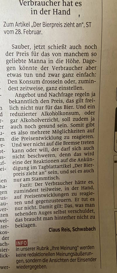 Sauber, jetzt schießt auch noch der Preis für das von manchem so geliebte Manna in die Höhe. Dagegen könnte der Verbraucher aber etwas tun und zwar ganz einfach: Den Konsum drosseln oder, zumindest zeitweise, ganz einstellen. Angebot und Nachfrage regeln ja bekanntlich den Preis, das gilt freilich nicht nur für das Bier. Und ein reduzierter Alkoholkonsum, oder gar Alkoholverzicht, soll zudem ja auch noch gesund sein. Somit gibt es also mehrere Möglichkeiten auf die Preisentwicklung zu reagieren. Und wer nicht auf die Bremse treten kann oder will, der darf sich auch nicht beschweren, denn das wird eine der Reaktionen auf die Ankündigung im Tagblattartikel „Der Bierpreis zieht an“ sein und sei es auch nur am Stammtisch. Fazit: Der Verbraucher hätte es, zumindest teilweise, in der Hand auf Preisentwicklungen zu reagieren und gegenzusteuern. Er tut es nur nicht. Damit gilt: Das, was man offenen Auges selbst verschuldet, das braucht man hinterher nicht zu beklagen.