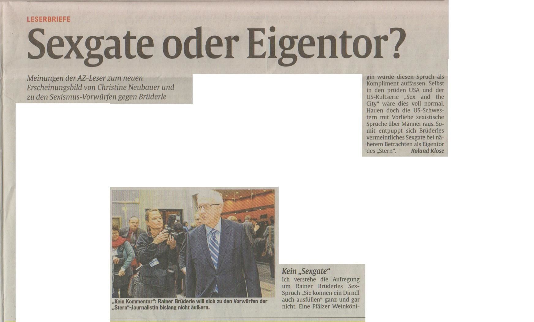 Ich verstehe die Aufregung um Rainer Brüderles (FDP) Sex-Spruch mit Blick auf den Busen von STERN-Schwesterle, Laura Himmelreich, "Sie können ein Dirndl auch ausfüllen", ganz und gar nicht. Eine Pfälzer Weinkönigin würde diesen Spruch als Kompliment...- Hinweis der Redaktion: Dies ist ein ungekürzter, unzensierter Originalleserbrief. Die Bürgerredaktion ist neutral. Verantwortlich für den Inhalt (auch der Kommentare) ist ausschließlich der Autor. Gedruckter Text ist farbig. Bewerten am Ende des Beitrags. INFO zum Autor, auch alle seine weiteren Artikel: klicken Sie bitte oben bei den Schlagwörtern den Namen des Autors. Ende des Hinweises.