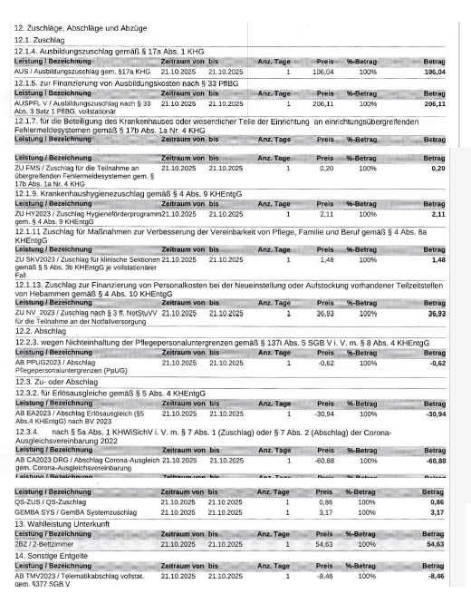 nach einem 1-tägigen Krankenhausaufenthalt habe ich die Rechnung erhalten. Diese enthält eine lange Liste von Zusatzkosten, insbesondere Zuschläge, die oftmals keinerlei Bezug zu meiner Behandlung haben. Bestes Beispiel: Zuschlag zur Finanzierung von Hebammen! Das ist Bürokratie pur! Die Liste ist angefügt.